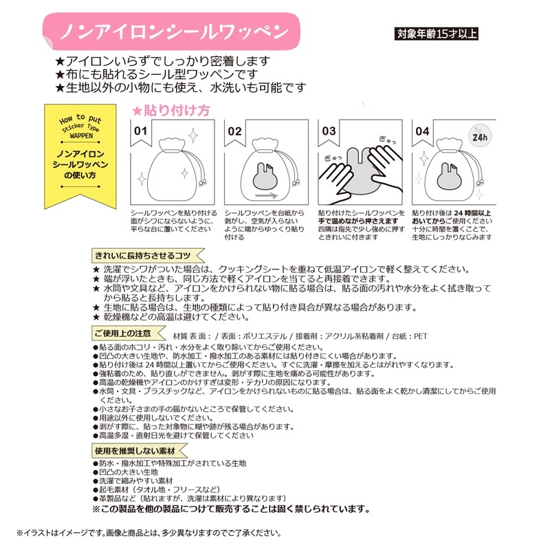アイロンいらずでしっかり密着する、布にも貼れるシール型ワッペンです。