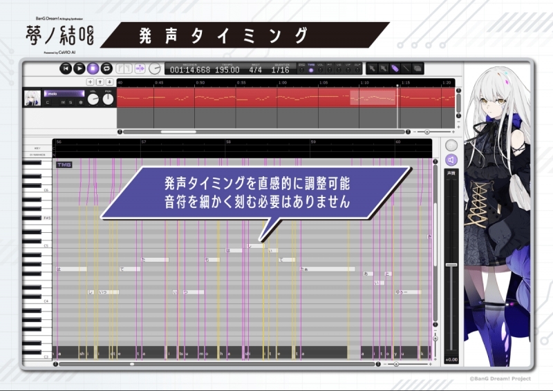 人間の歌声をリアルに再現するだけでなく、使いやすいGUIにより、ピッチパターンやタイミング等を自在に編集することが可能で、音声創作の可能性を大きく広げます。
