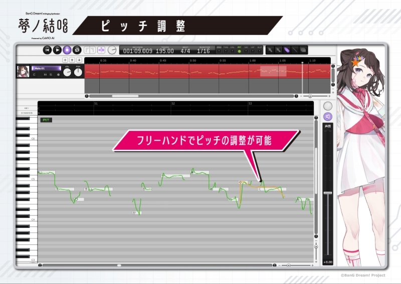 人間の歌声をリアルに再現するだけでなく、使いやすいGUIにより、ピッチパターンやタイミング等を自在に編集することが可能で、創作の可能性を大きく広げます。