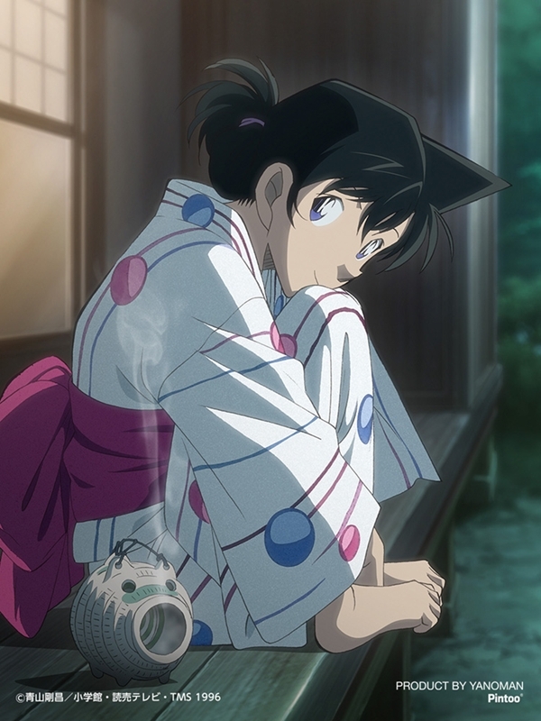 『名探偵コナン』のキャラクターたちが過ごす、花火に彩られたお祭りの夜をイメージしたシリーズ。体を丸め、縁側に座る姿が愛らしい毛利蘭。ロマンティックなひと時を楽しんでいるようです。