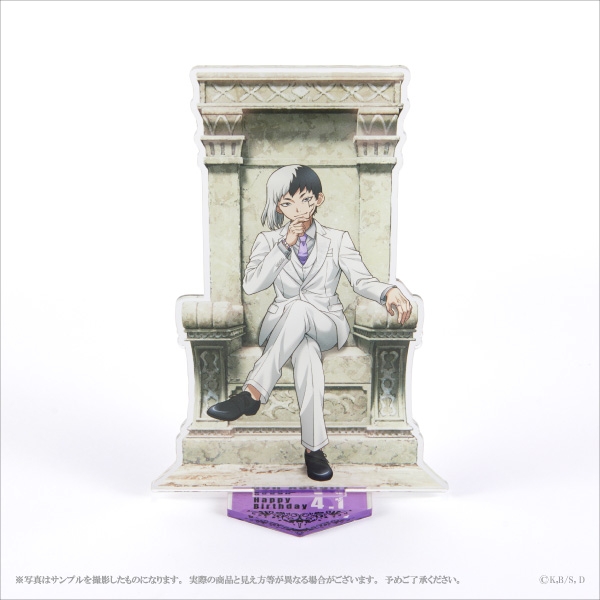襟にイヌホオズキの刺繍があしらわれた白スーツ姿のあさぎりゲンのイラストを使用したアクリルスタンド。