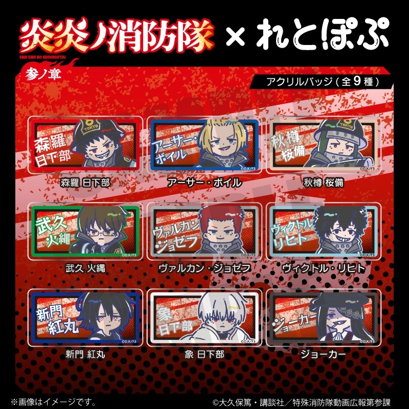 大久保篤先生原作の人気アニメ「炎炎ノ消防隊」より、キャラクターグッズ『【グッズ-バッチ】TVアニメ『炎炎ノ消防隊 参ノ章』 れとぽぷ アクリルバッジ(全9種)秋樽 桜備
