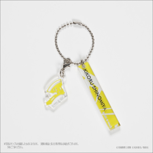 キャラクターネームパーツとキャラクターアイコンをモチーフにデザインされたアクリル製のキーホルダー。