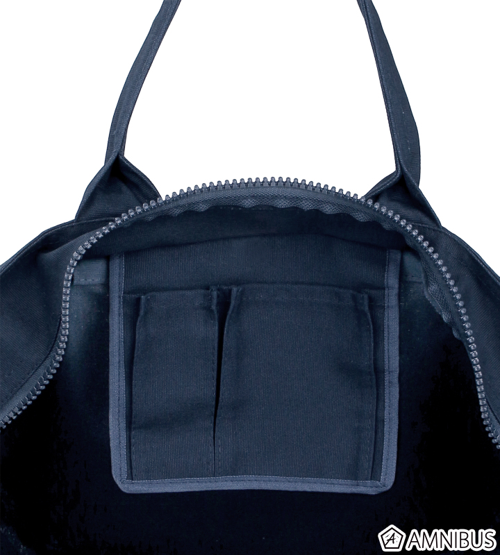 厚みのある生地で、開け口にはジッパーがつき、大容量の収納に適しています。