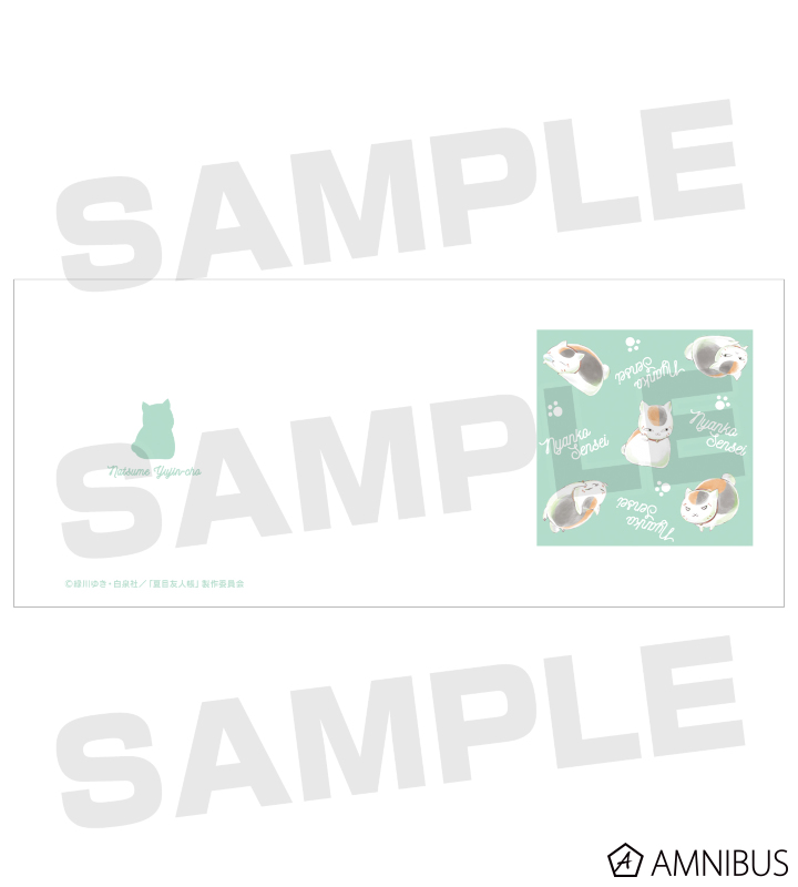水彩風に仕上げた様々な表情のニャンコ先生を足跡などと組み合わせ、緑色の背景を敷いたデザインに仕上げています。