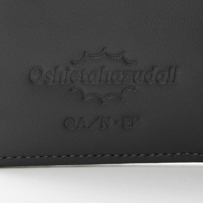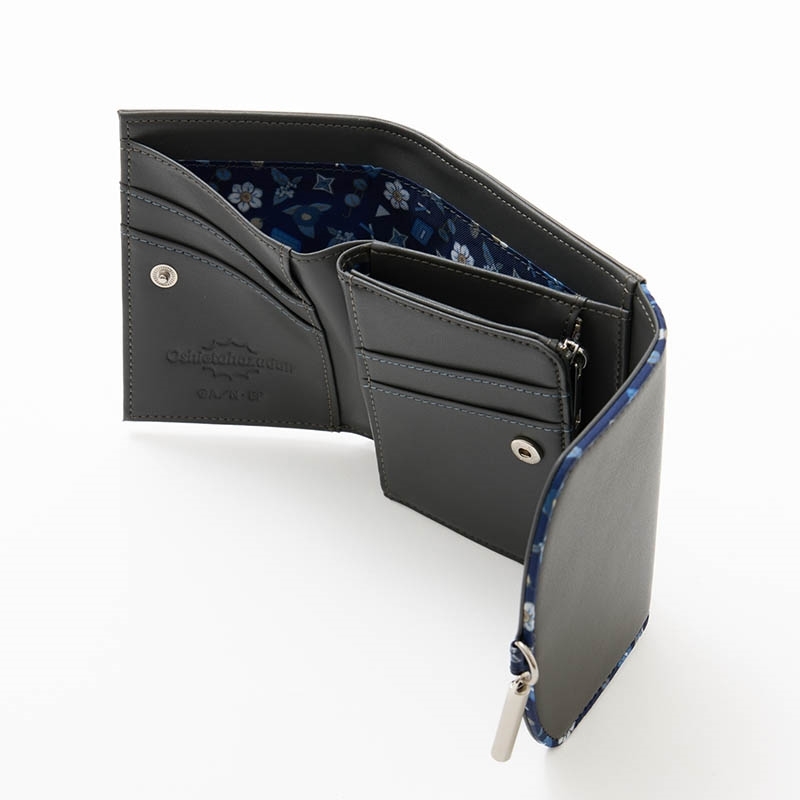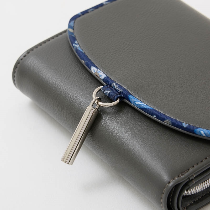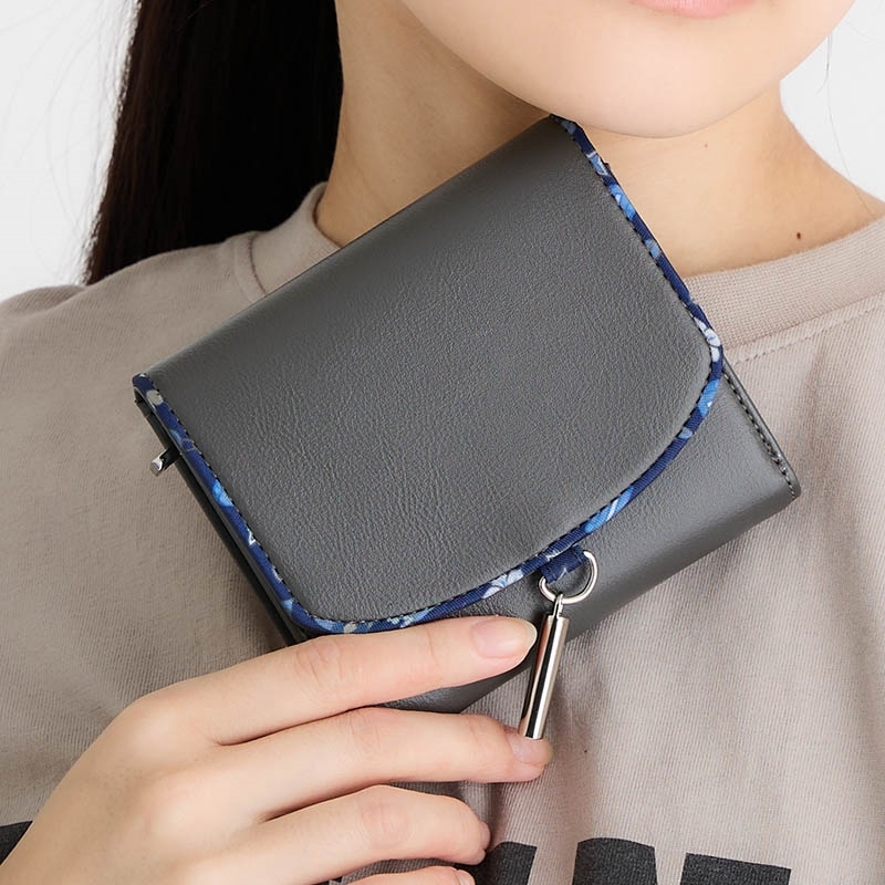 チョークをイメージしたチャームがゆれる、落ち着いた墨色の三つ折り財布。