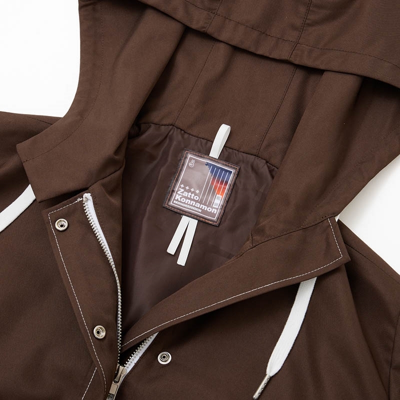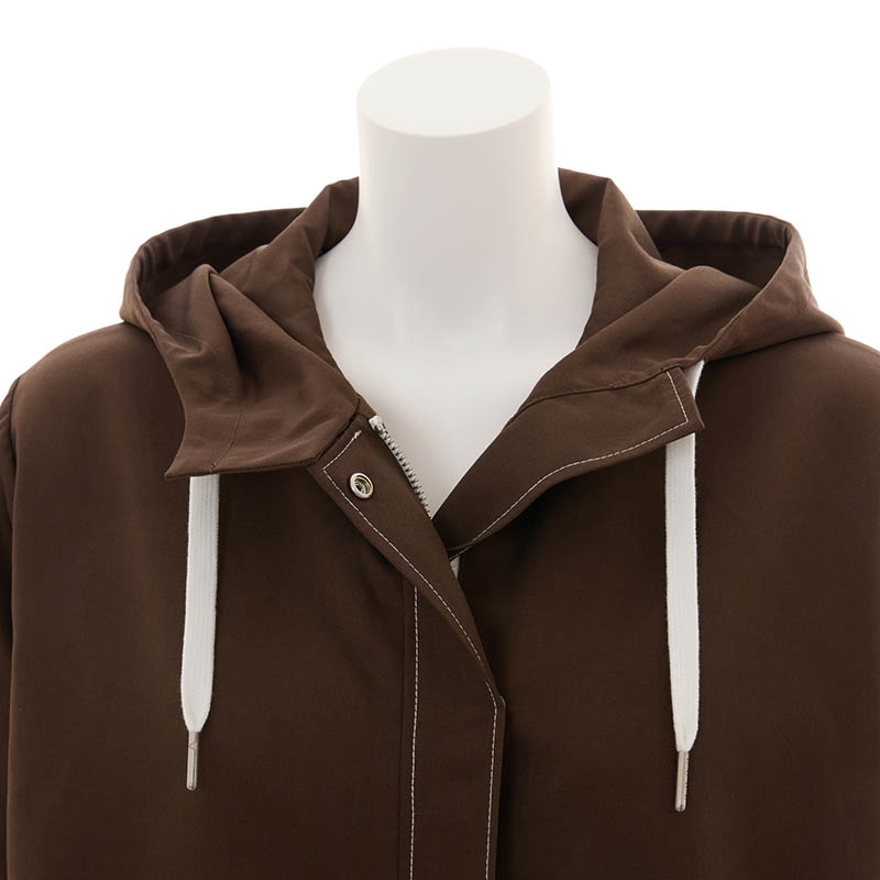 茶色のゆったりとしたシルエットが印象的なフード付きアウター。