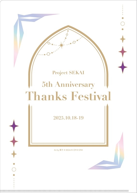 イベント『プロジェクトセカイ 5th Anniversary 感謝祭』開催記念クリアファイルです。薫子さん描き下ろしの総勢26人のキャラクタービジュアルをプリント。オーロラ仕様のキラキラとした仕上がりで、キャラクターたちがますます輝きます♪