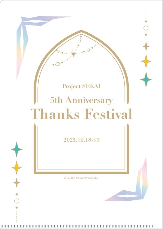 イベント『プロジェクトセカイ 5th Anniversary 感謝祭』開催記念クリアファイルです。薫子さん描き下ろしの総勢26人のキャラクタービジュアルをプリント。オーロラ仕様のキラキラとした仕上がりで、キャラクターたちがますます輝きます♪