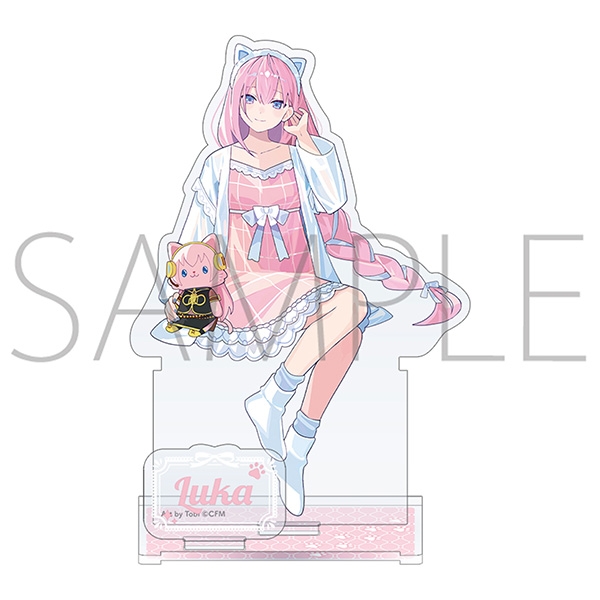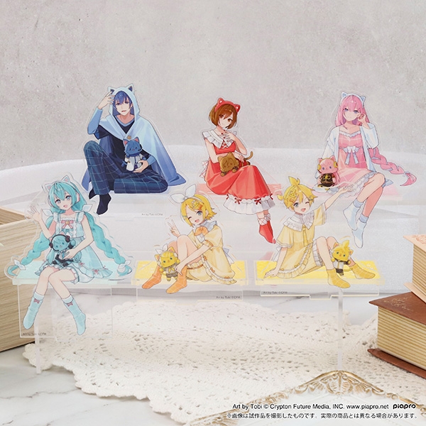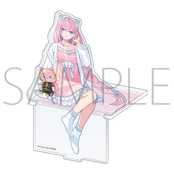 ルームウェアを着てwithCATと一緒にくつろいでいる姿の描き下ろしイラストを使用したアクリルスタンドが登場! 台座と組み合わせることで棚の縁などに座らせることも可能です。