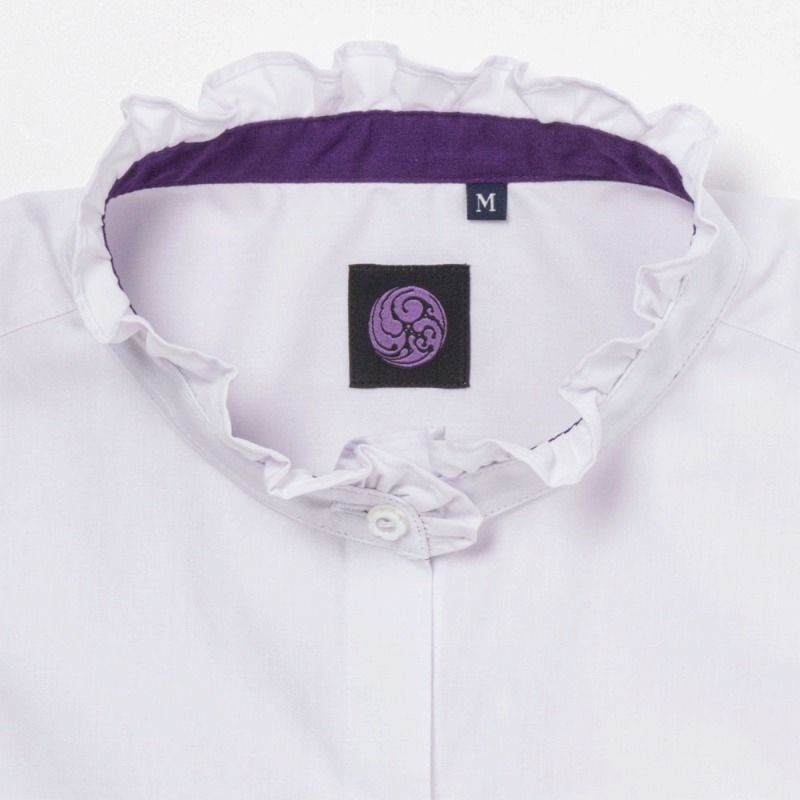「歌仙兼定」をイメージした形態安定加工のレディースのエレガントなバンドカラーのデザインフリルのシャツです。