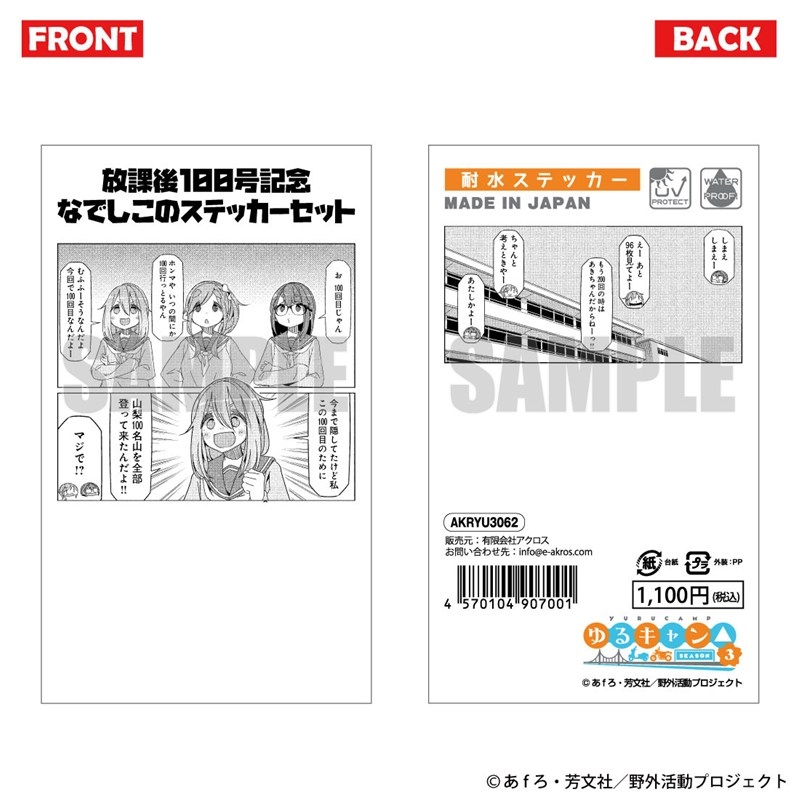 あfろ原作のアニメ「ゆるキャン△」よりキャラクターグッズ『https://www.animate-onlineshop.jp/pn/%E3%80%90%E3%82%B0%E3%83%83%E3%82%BA-%E3%82%B9%E3%83%86%E3%83%83%E3%82%AB%E3%83%BC%E3%80%91%E3%80%8E%E3%82%86%E3%82%8B%E3%82%AD%E3%83%A3%E3%83%B3%E2%96%B3+SEASON%EF%BC%93%E3%80%8F+%E6%94%BE%E8%AA%B2%E5%BE%8C100%E5%8F%B7%E8%A8%98%E5%BF%B5%E3%81%AA%E3%81%A7%E3%81%97%E3%81%93%E3%81%AE%E3%82%B9%E3%83%86%E3%83%83%E3%82%AB%E3%83%BC%E3%82%BB%E3%83%83%E3%83%88%E3%80%90%E3%82%A2%E3%82%AF%E3%83%AD%E3%82%B9%E3%80%91/pd/3382315/』が、アニメイト通販で取扱中。